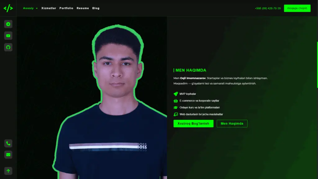 ioqil.uz — bu mening shaxsiy portfolio saytim bo‘lib, unda xizmatlarim, loyihalarim va blog postlarim jamlangan. Sayt orqali mijozlarim va hamkorlarim mening ish tajribam, yo‘nalishlarim hamda ko‘rsatadigan xizmatlarim bilan yaqindan tanishishlari mumkin.