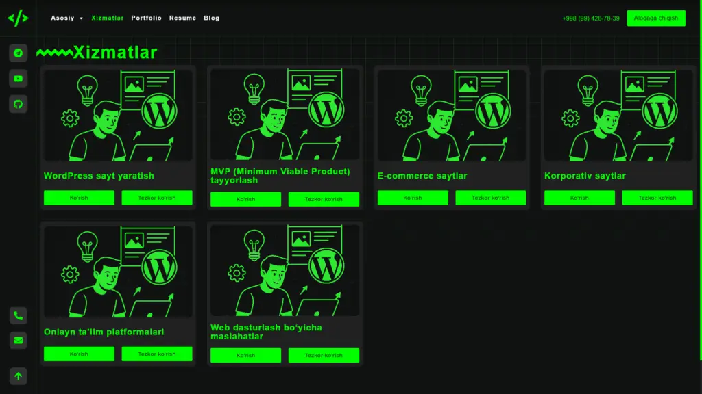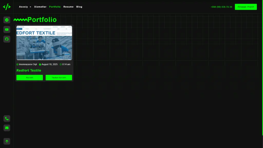ioqil.uz hozirda mening asosiy shaxsiy vizitkam hisoblanadi. Sayt orqali yangi mijozlar bilan aloqa o‘rnatish, xizmatlarimni taqdim etish va tajribamni ulashish jarayoni samarali yo‘lga qo‘yilgan.